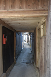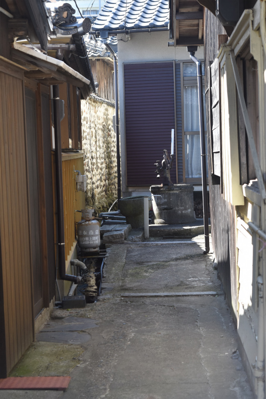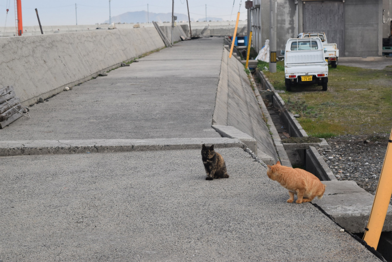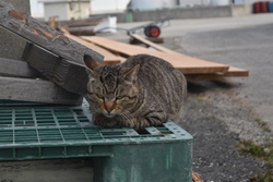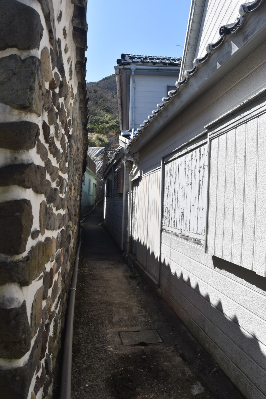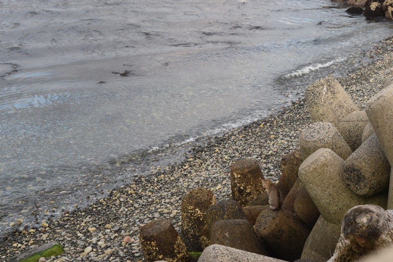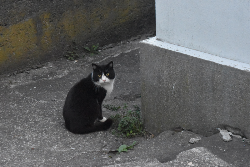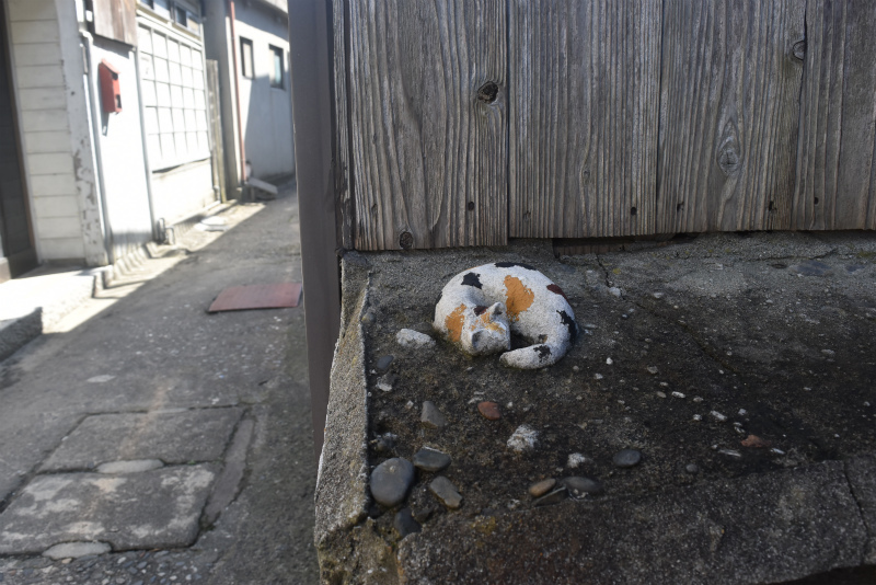 夜中から暴風雨で翌日は雨。ヒジキの作業もお休み。午後には雨がやみ、外に出て大好きな「狭い路地」だらけの集落をまた散歩。猫を激写。