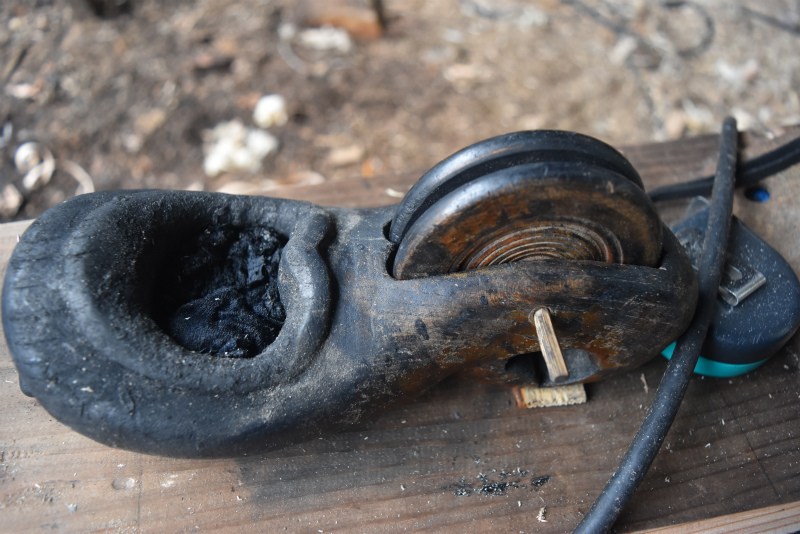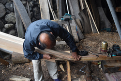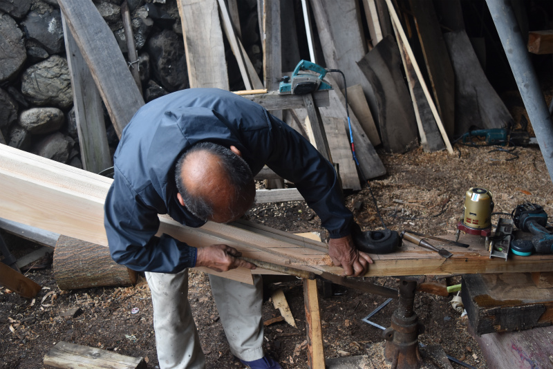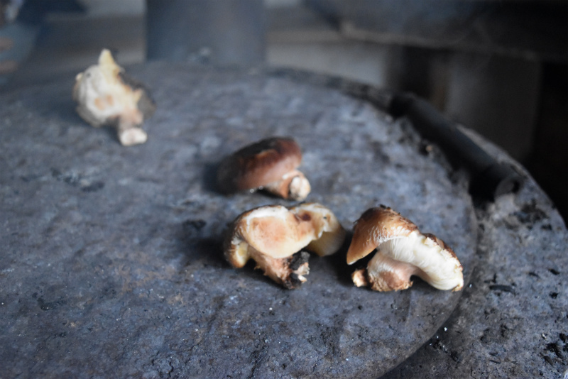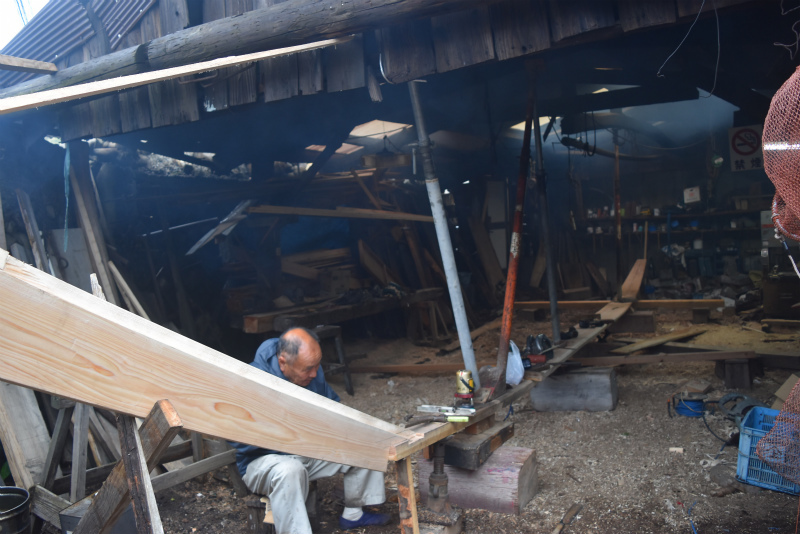 その大工さん、無愛想のようで、実はお茶目で優しい方。ちょうど8月にある神事の木造和船の基礎作りをしているところで、近所の仲間のおじいさんたちも集まって来て、まだ14時なのに出された飲み物は月桂冠。つまみは薪ストーブでじっくり焼いた地元のしいたけ。うれし涙!!!!!