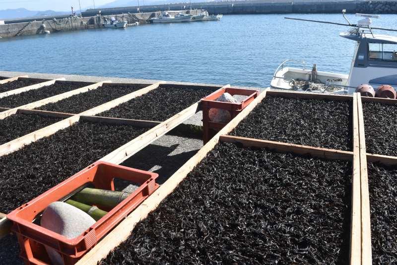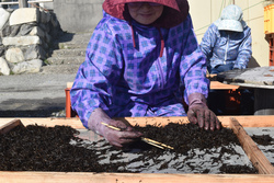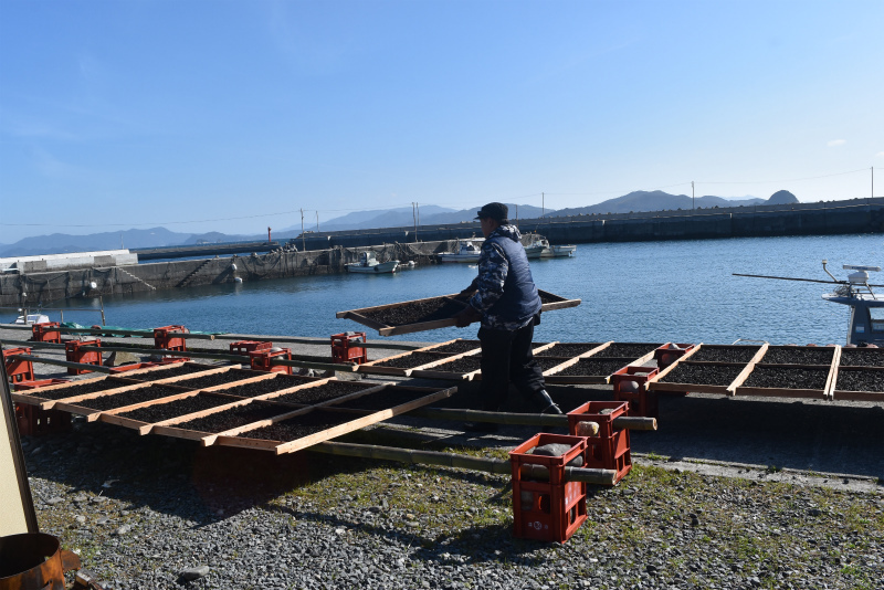 3日目は快晴! 鉄釜で炊いたヒジキを海辺で干すための作業のお手伝いをさせていただきました。島の女性(殆どが80歳前後のおばあちゃん)が中心。朝早くからワイワイ話しながら作業するのが楽しいと、口も手も忙しく動かしていました。手早い!熟練の技!