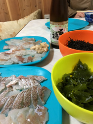 夕食は炬燵に入りながら、鯛とメバルとカワハギ(肝つき!)のお刺身に鯛のアラの味噌汁。お味噌はお隣の奥さんが代々作っているちょっと米も入っている麦味噌です。釜あげひじきには金柑スライスを混ぜて。島のお野菜もたくさん食べ、大大大満足でした。もちろんお酒もすすみます。