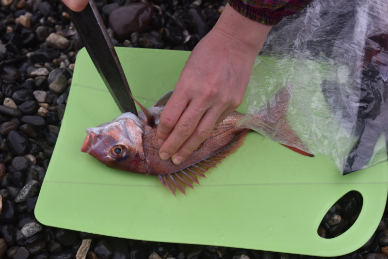 島に取材で来ているうちに自然に覚えたという山秋さんは、海岸でピチピチの鯛とメバルとカワハギの内臓を出刃包丁でバシバシさばき、私はもっぱら魚を海で洗う役目。