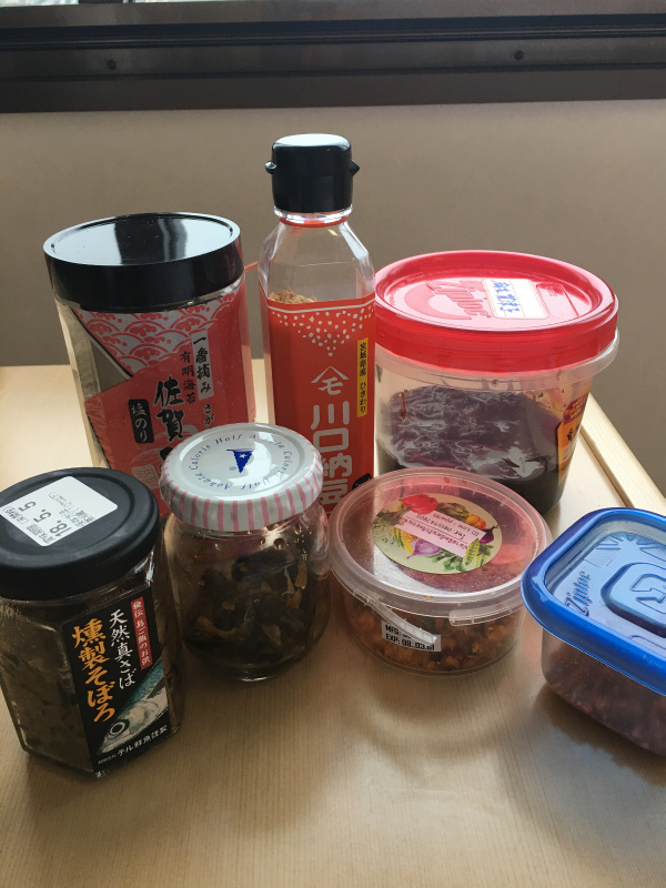 祝島でいただいた梅干し、従姉妹が酢の物にしてくれたひじき、乾燥納豆、きゅうりのお漬物、唐辛子ふりかけに海苔に福江島名産、絶品さば燻製そぼろ。