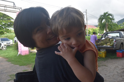 それまでは雨がよく降っていたのですが金曜日あたりからまた晴れるようになり、土曜日の朝の天気は今週も腫れ! 日本から帰って来たせっちゃんと一緒に散歩と買い物と市場の惣菜での朝ごはん。ここに時々ウェウが加わるのですが、今回は娘と孫と一緒に来ました。娘のプライちゃんは25歳。最初に会った時は確か赤い制服=幼稚園だったような。それが今ではお母さん!そしてイギリス人の夫との間に生まれた男の子が、まるで外人! ハーフ感なし。