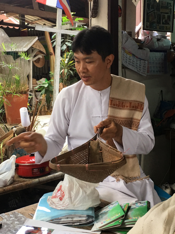 彼はお爺さんから受け継いだ伝統的な技術で、旗や灯篭を作る紙細工職人です。ロイクラトーンなどのお祭りやお寺の行事には欠かせないもので、その繊細な紙細工を以前日本の展覧会で使うために、私も何度かノパドンさんの工房へ足を運びました。その頃はまだ息子さんが小学校高学年くらいだったのですが、すでに大学生になってお父さんの仕事を立派に継ぎ始めているのとのこと。