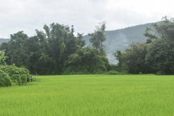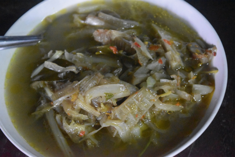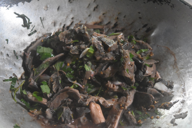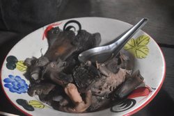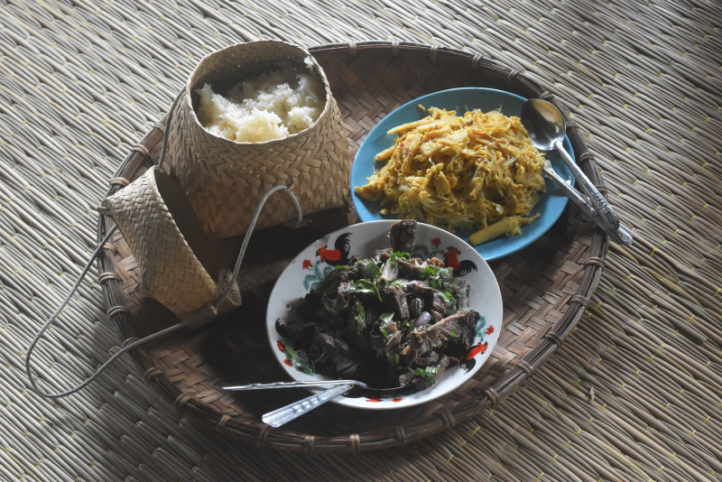 自宅から1時間半で到着するので、お昼前に着いて早速ご飯です。とても美味しい茹でキノコのヤム(サラダ)とタケノコと卵炒め。そして絶品「山のもち米」!
