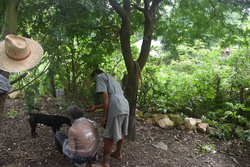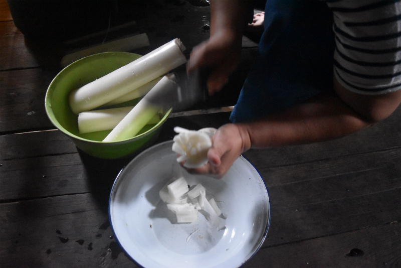 学校から帰って来たウィ君がバナナの茎を採って来てくれました。それを調理するのは奥さん。
