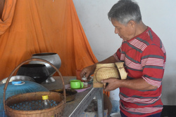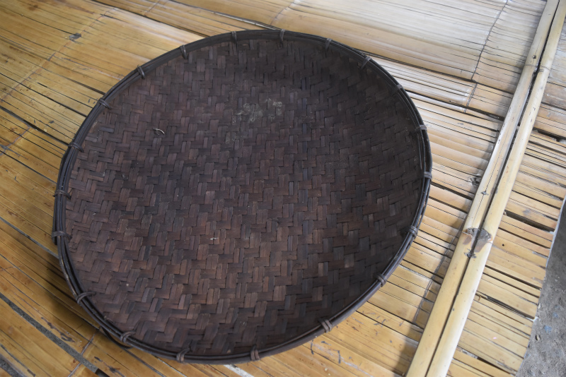 村で編んでいるザルや籠。それを普段使う七輪の煙で燻しています。