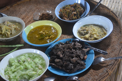 鶏のカレーとパッガヨーのキュウリのヤム(レモングラスのニンニクと唐辛子と塩が少し)、ナンプリック カー(南姜のディップ)、茹でキノコ、昨晩の残りのおかずに手を加えて、もち米と一緒に。超豪華です。