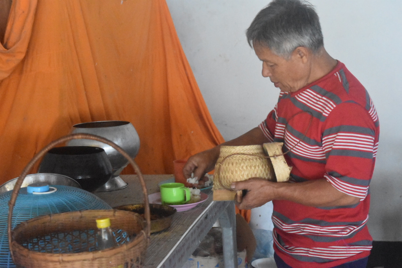 私たちはお父さんと一緒にお寺へタンブンに。鶏のカレーともち米とお水を持って。