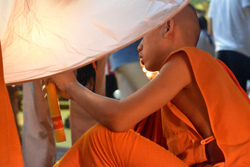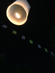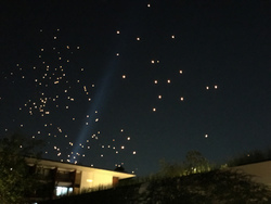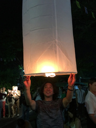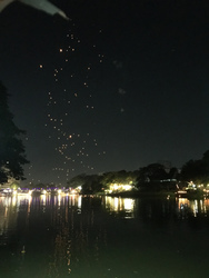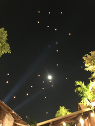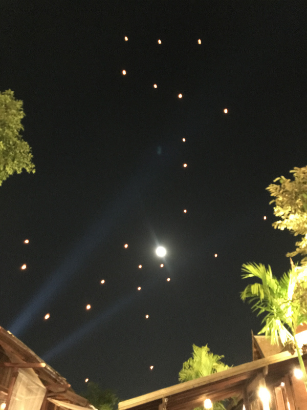 お坊さんに火をつけてもらい、まわりのタイ人の人たちに、もう少しとか、そろそろだとか助言を受けながら、満月の空へむかって揚げました。