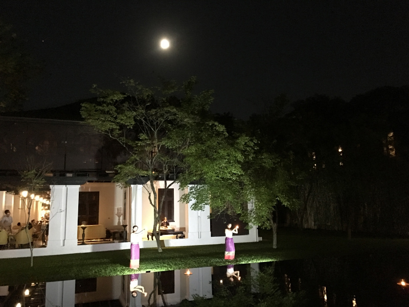 アナンタラホテル(元チェディ)に入ったら、レストランの方はイベントでたくさんの人でしたが、ロビーまわりは人もまばらな上、コムローイが綺麗に見え、さらにその人がまばらなロビーに向かって、タイ舞踏が始まり、ゆっくり鑑賞させていただきました。