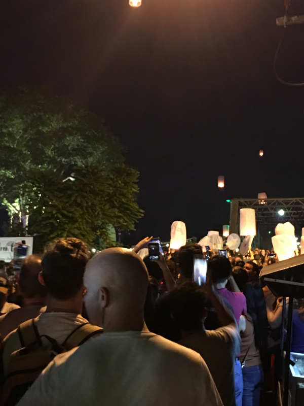 規制が厳しいから21時以降じゃないと揚げられないんじゃない?!とか言っている矢先にもうガンガン川の向こうからあがりはじめ、灯篭もたくさん流れて来て、あっという間に人も増え、すっかりローイクラトンのお祭りに。
