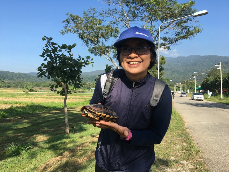 この間はコンクリートの道を亀が歩いているのをウェウと発見。亀をたくさん飼っている亀好きの彼女は車にひかれないようにと、水辺に近いところに亀を連れていってあげました。仏教の教えでは、こうして亀を助けたウェウと私は、来世でもまた出会い仲良くするのだそうです。