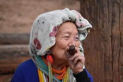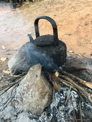 おばあちゃんも早起き。家の前で焚き火をして、お湯を沸かして、たばこ一服。