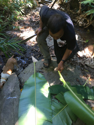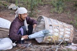 一人で村を散歩していたら、青年が朝早くから働いていました。ユーカリの葉を束ねて、