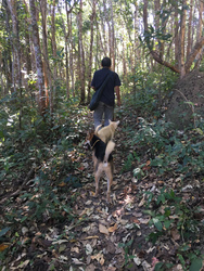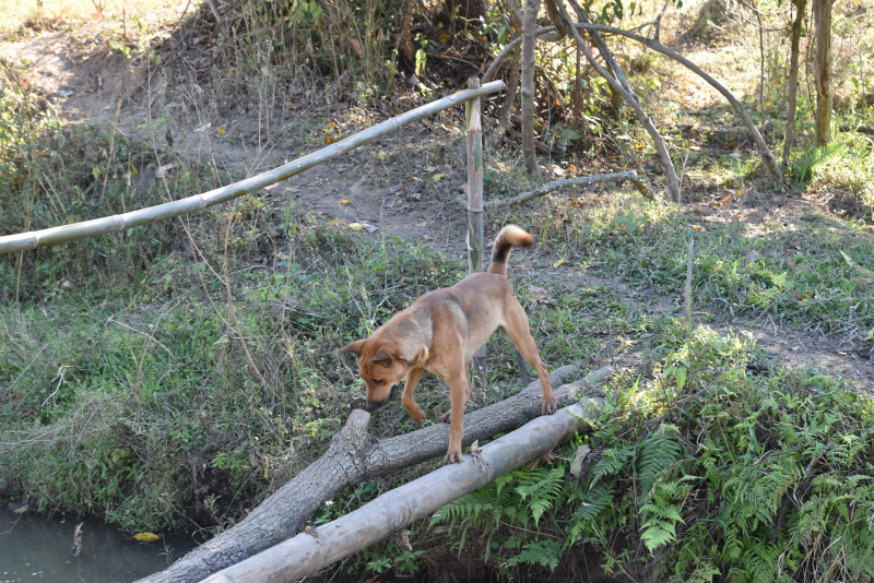 さて2日目は森へのトレッキング。タム君のお父さんとポウリーヌ、そして犬たちが一緒です。