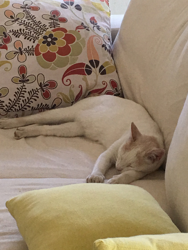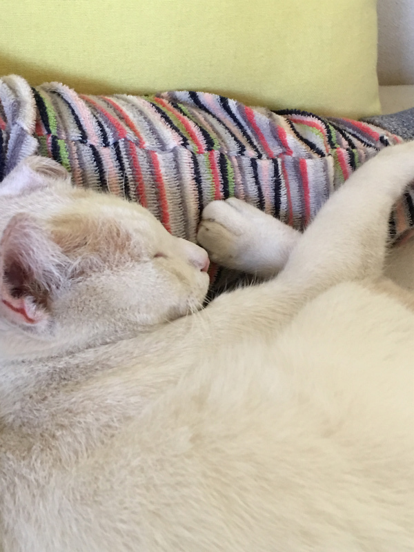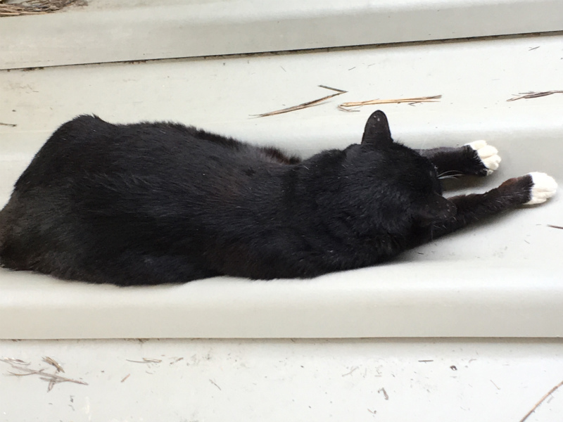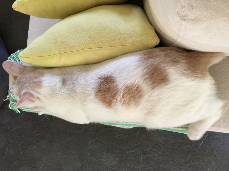 まるちゃんという名前の猫が、股の間で爆睡中。(家のガラス扉は開けっ放しだったので)