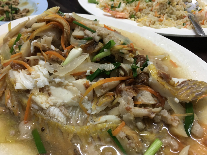 野菜とキノコとちょっと豚肉がこれでもか!と梅干しと一緒に蒸されていて、川魚臭さは一切なく、汁も飲み干したいくらい美味しいです。
