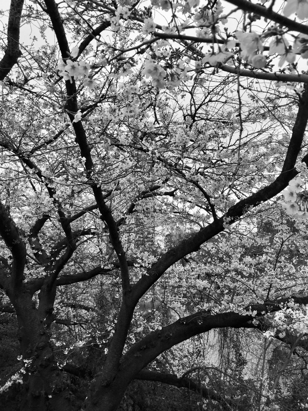 上の写真のような鮮やかな色の桜の花の写真を・・・と思っていたけれど、ほとんど太陽を見ることもなく、雨は昨晩少し降ったくらいで、曇天。