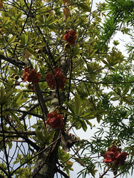 沙羅双樹は日本では夏椿のことで、白い花が咲くそうなのですが、タイ仏教では、沙羅双樹=ほうがん木(砲丸木)のことで、いかにも南国な感じの赤い大きな花が咲きます。