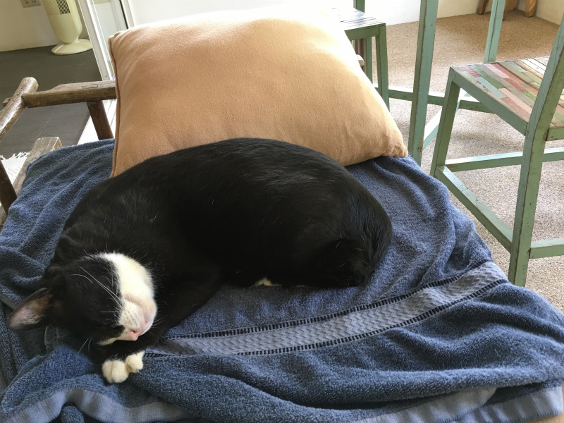 きっちゃんが死んだ日、まだ生きている日中に、きっちゃんからぶっちゃんへ何らかの引き継ぎがあったらしいと勝手に思い、だからなのかその日からずっと私の家で寝ているぶっちゃん。もちろんお隣りさんの飼い猫なのでそのあたりは深入りしないように心がけています。