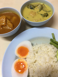 ゲーンキオワーン(グリーンカレー)と魚のゲーンソム(日本語分からず)、絶品ゆで卵付き。