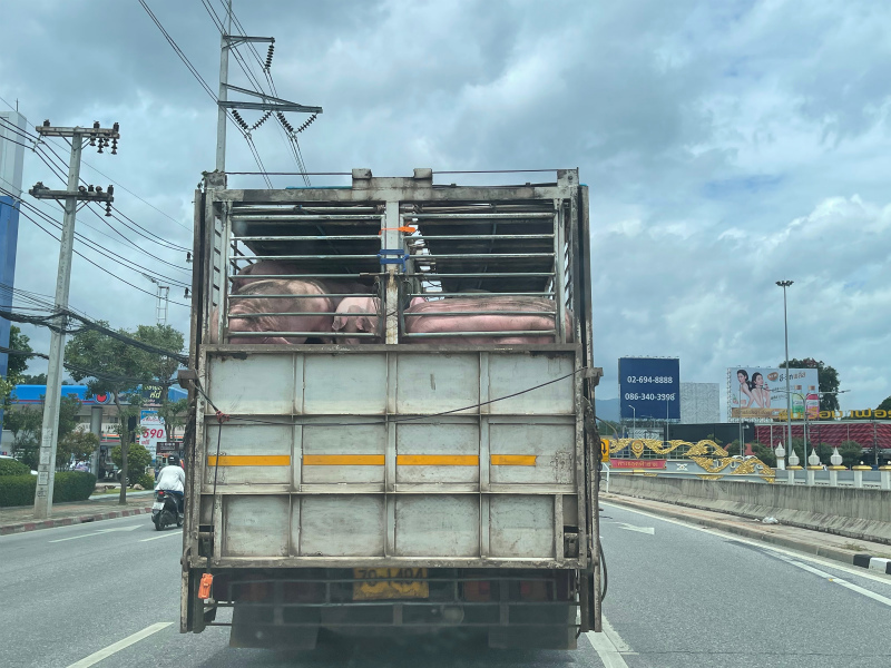 で、病院の前に腹ごしらえと思って、タニン市場で豚肉のガパオライス目玉焼きのせを食べよう!と運転していたら、前にブタちゃんが、、、、。