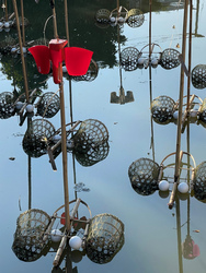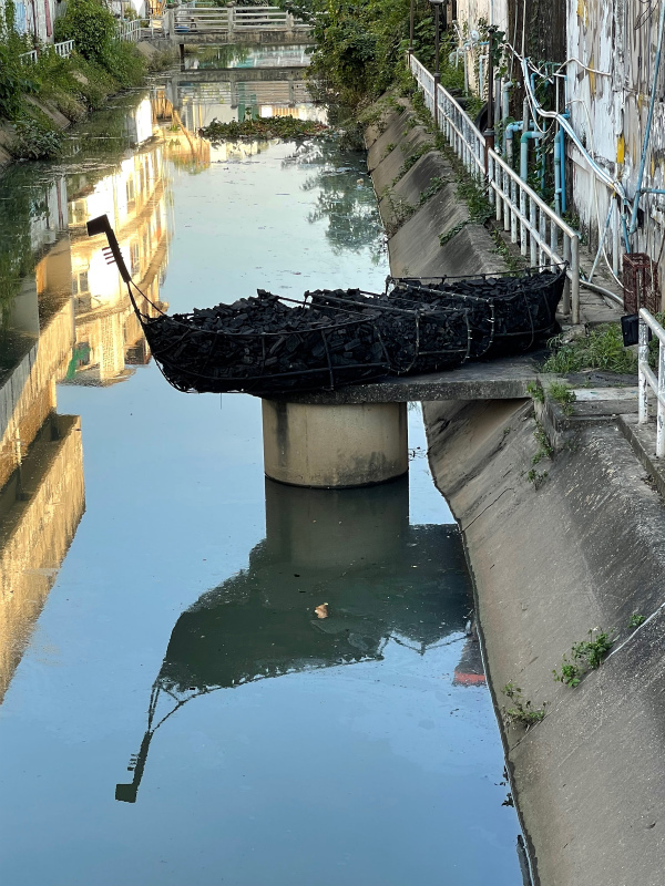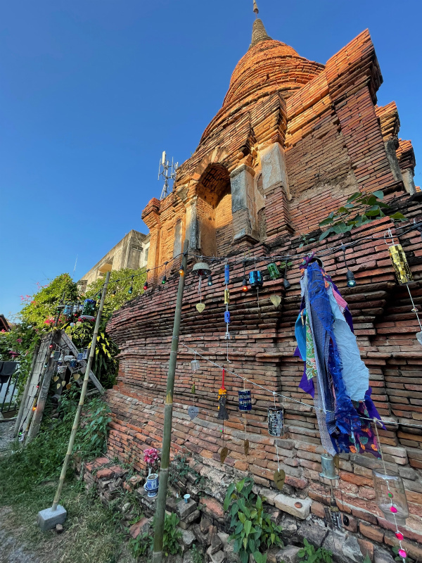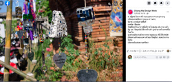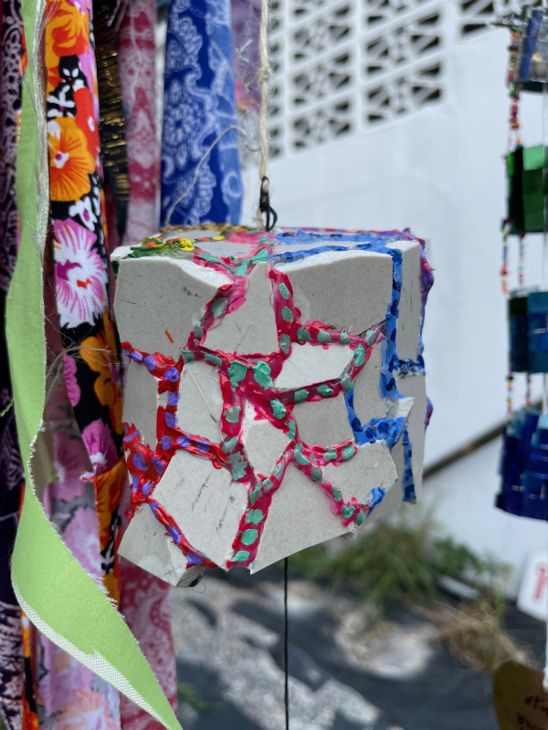 彼の作品は、近所のお店から譲ってもらった廃材を利用して作ったオブジェを、鐘にみたてて吊るしています。