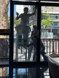 でもちょうど、大切なお客様の団体が来るとかで、会議室の窓ガラス掃除中でした。