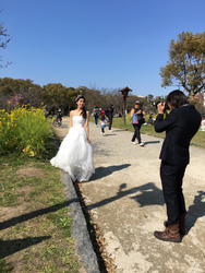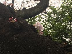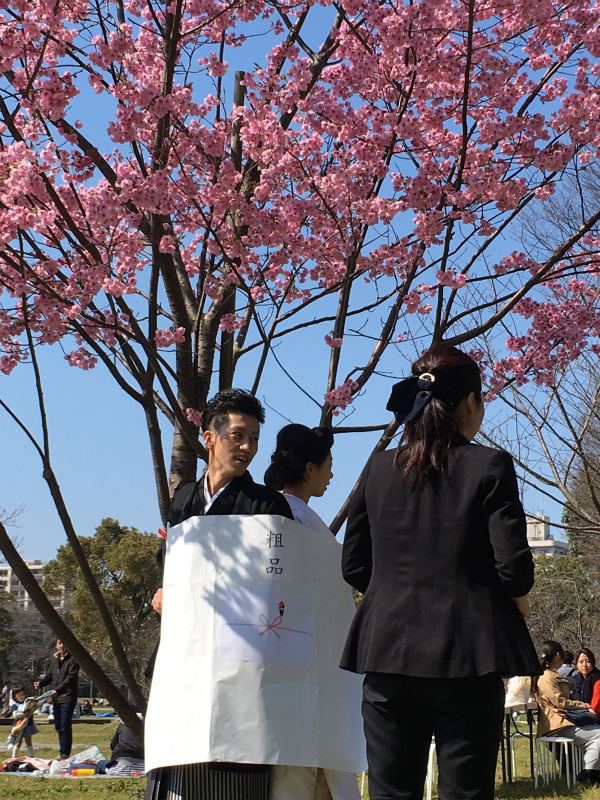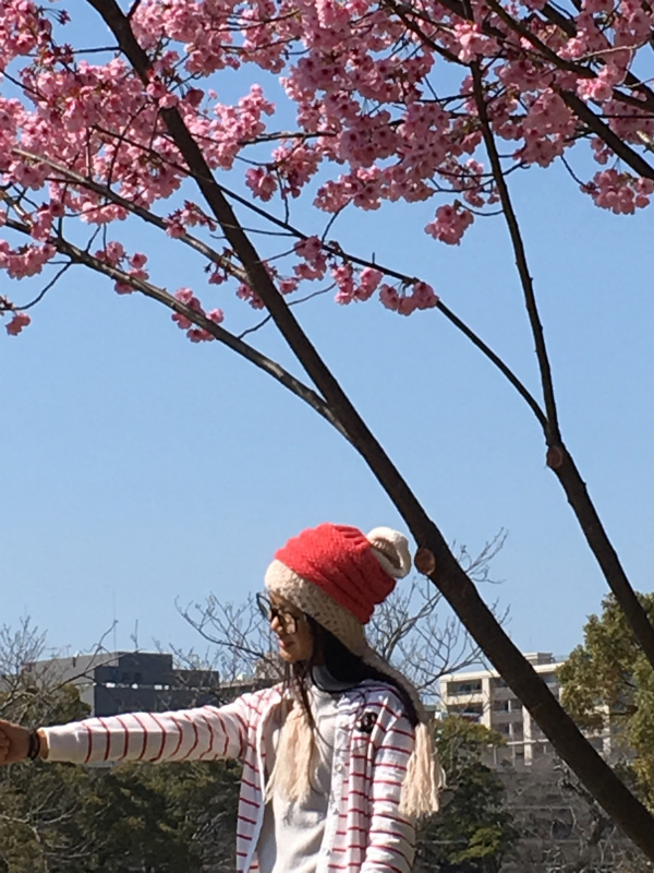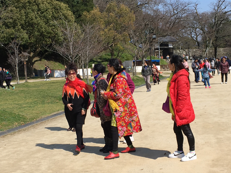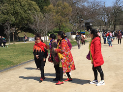 きっと桜満開のツアーだったのだと思うのですが残念なことに殆ど咲いていません。でも早咲きの桜の木に皆殺到しとても楽しそうに激写していました。その様子を見ながらのお花見。次から次へと来る中国の方々の衣装や行動に釘付けになりながらの、楽しい宴となりました。