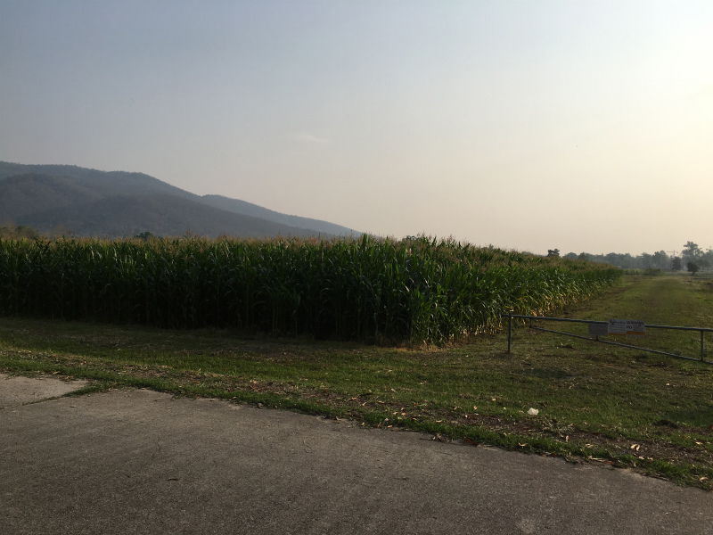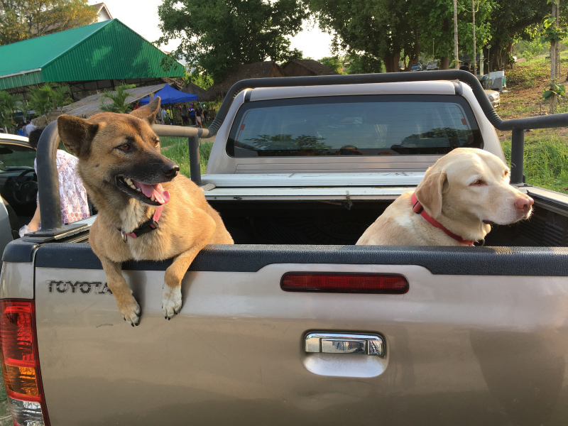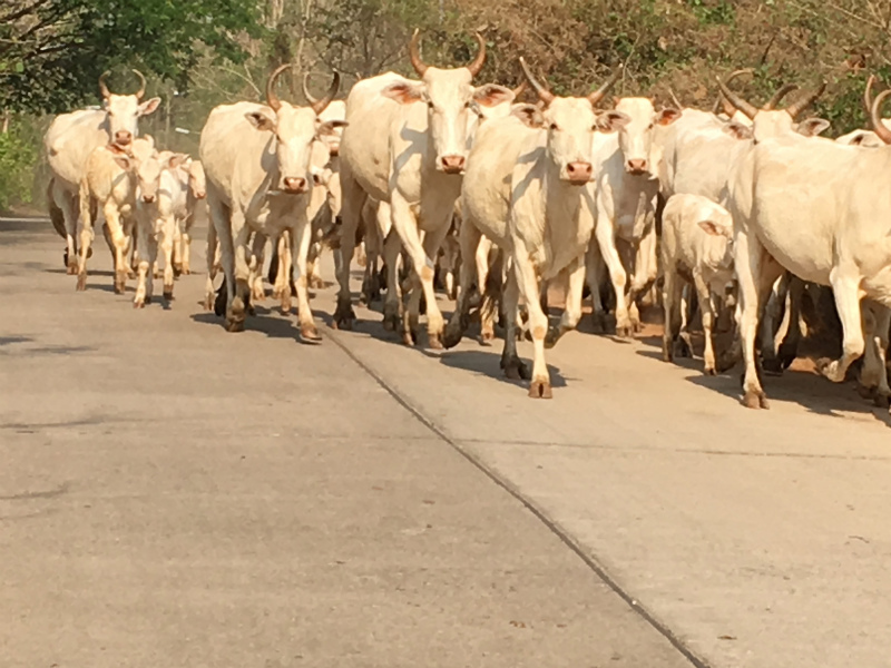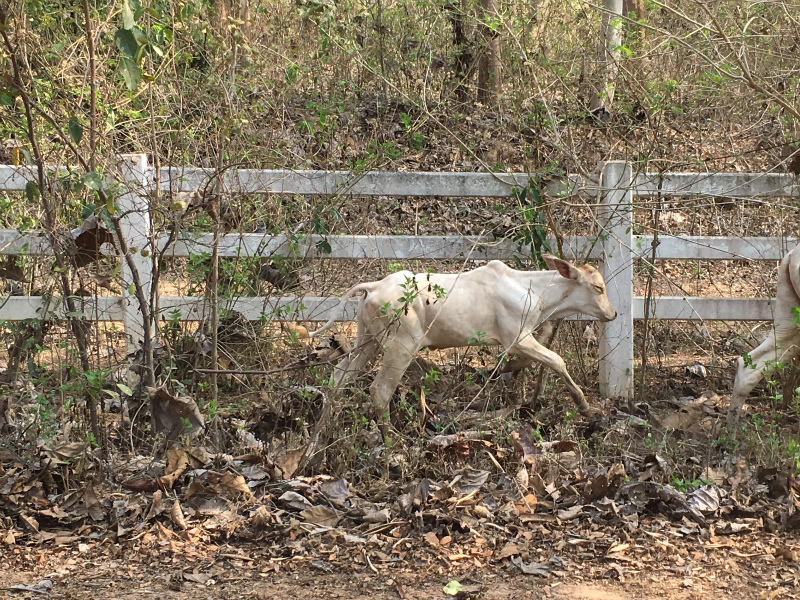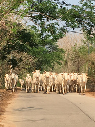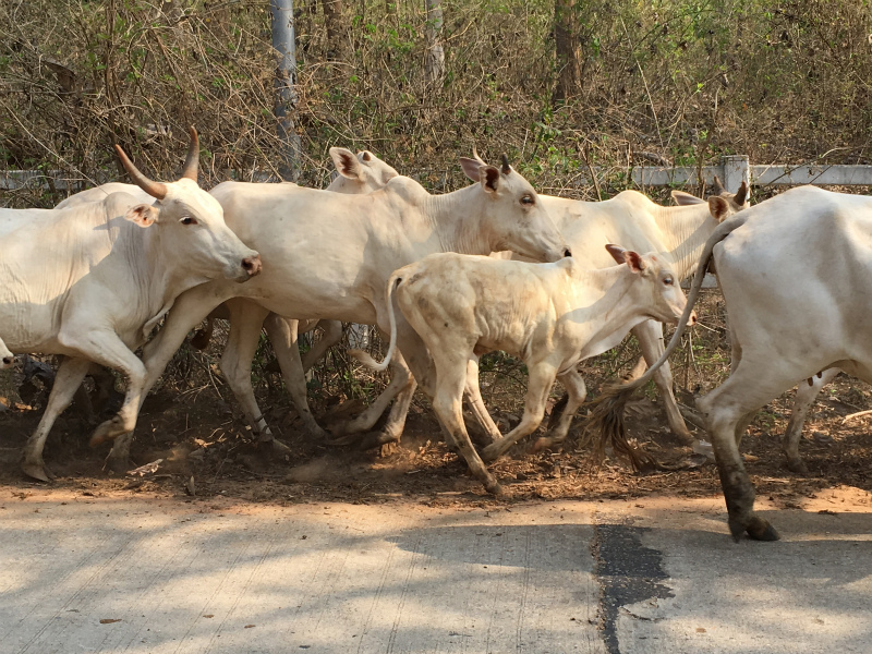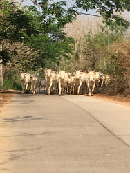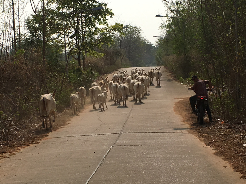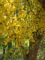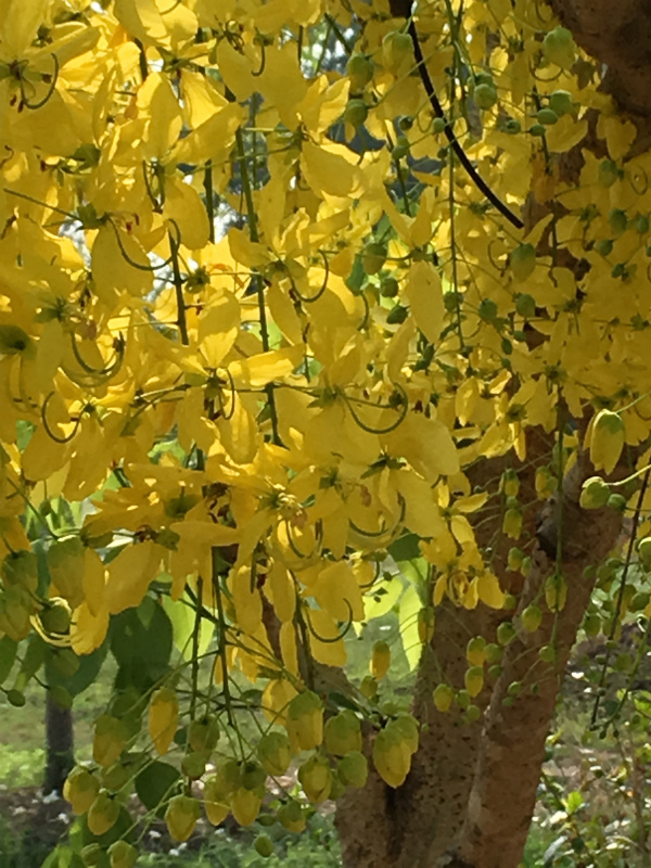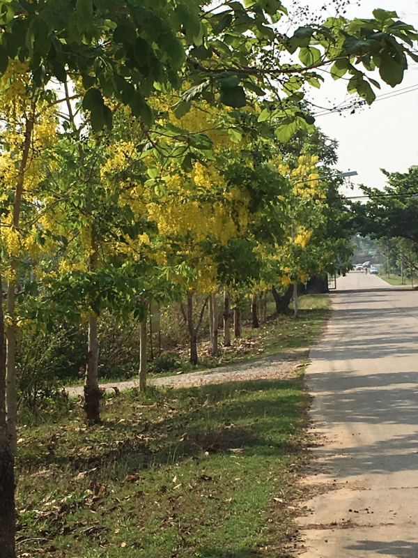 牛の激写後は、ラチャプルック(英名:ゴールデンシャワー・タイの国花)の花がきれいに咲いている道をさらに歩きます。満開から少したっているけれど、青い空に黄色の花と緑の葉が鮮やかで、タイの夏の暑い時にピッタリ!