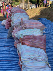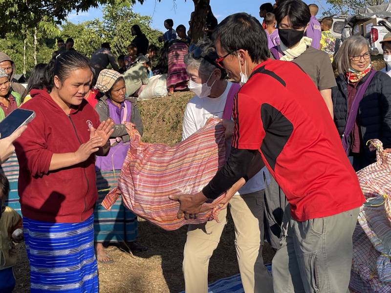 準備した衣類と保存食の入った袋を、1家族に1つ渡し、文房具や塩漬け魚、再びお菓子、そしてヒートテックを配り、無事終了。