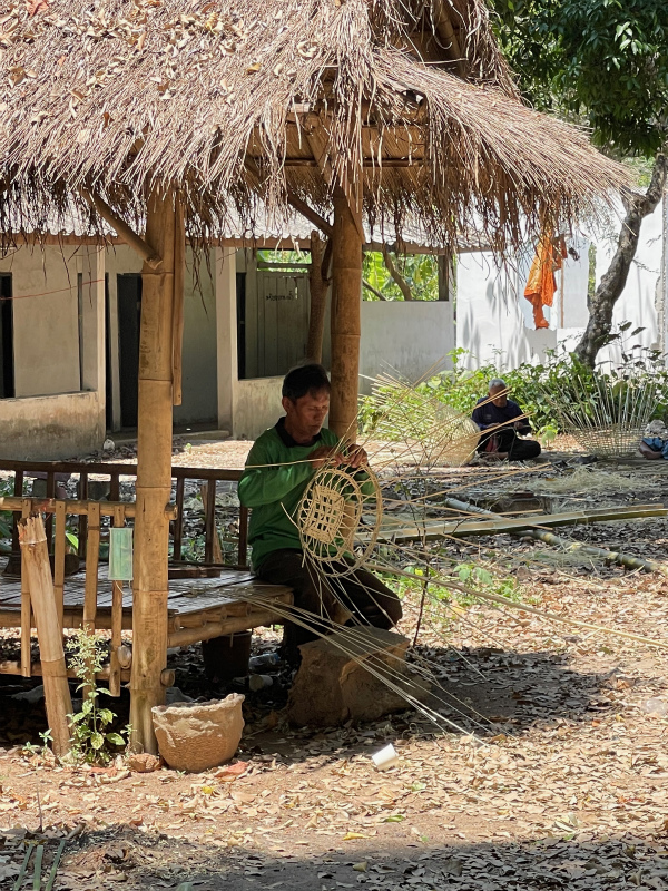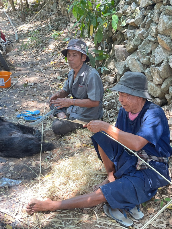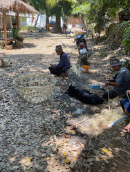 丁度ソンクラーン前で、竹籠編むことが出来る人はお寺集合!という朝の放送で集まった叔父さんたちが、お寺に奉納するための籠を製作中。