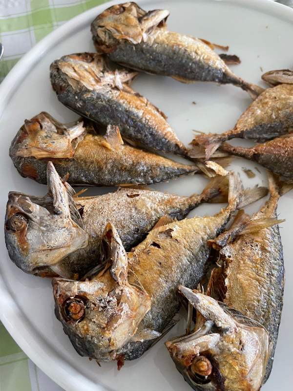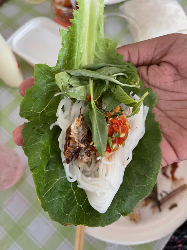 今回は、ちょっと塩気の強い鯖の仲間のプラトゥ揚げと、ハーブ野菜と、カノムジーン (発酵麺)に辛い自家製タレを付けてサラダ菜に包んで食べるというもの。