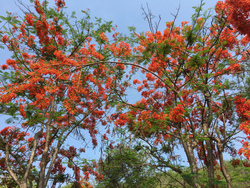 金曜日に行ったカレン族の村の話しはまた次回書くとして、いつも行く土曜朝市の火炎樹がとても綺麗でした。ハーン ノックユーン(孔雀のシッポ)と呼ばれるこの木は4月の暑い暑い時にラチャプルック(ゴールデンシャワー)とともに咲くのですが、今年は全体的に遅め遅めのようです。