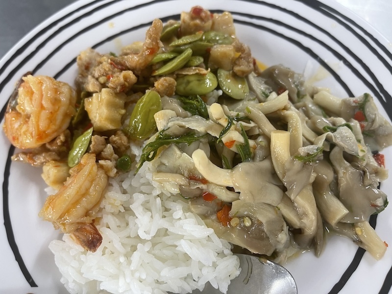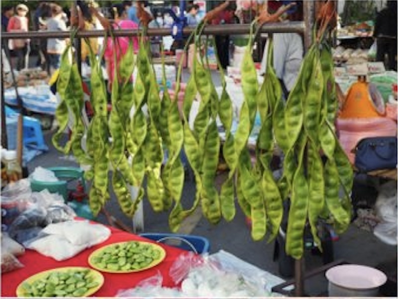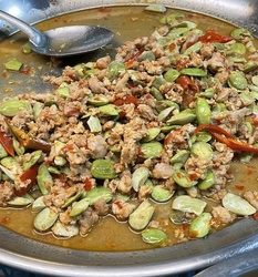 タニン市場のすぐ近く。惣菜屋さんにちょうどサトー豆とエビの炒め物(ผัดสะตอกุ้งสด)があったので、おかず掛けご飯に。