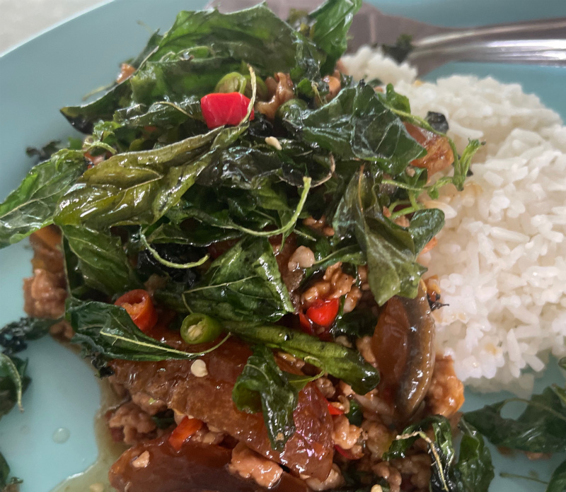 出発前に食べたいものの中から悩んだ末に選んだのは、タニン市場のピータンガパオライス。