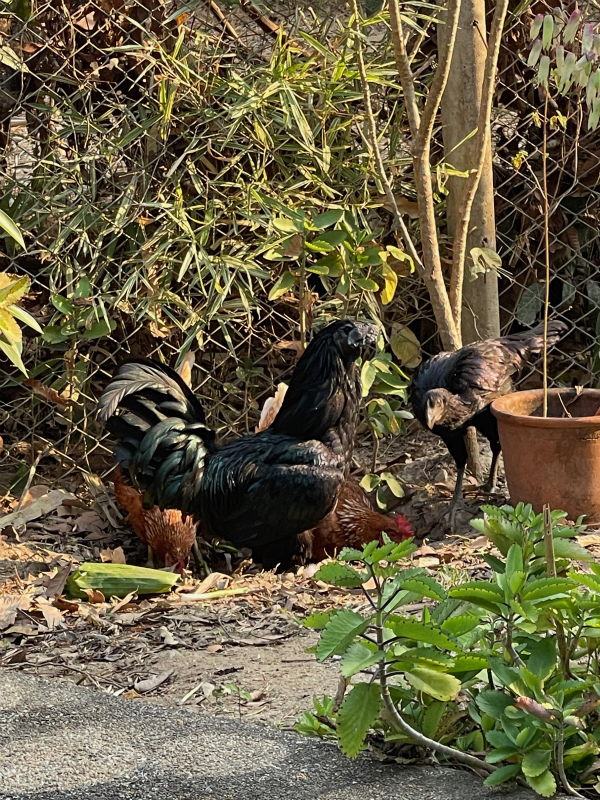 最近、近所の家が飼い始めた鶏たちが、私の家に来ます。