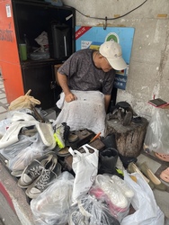 市場の道路沿いの小さなスペースにいるオジサンは、かなり人気の靴修理屋さんのようでした。
