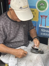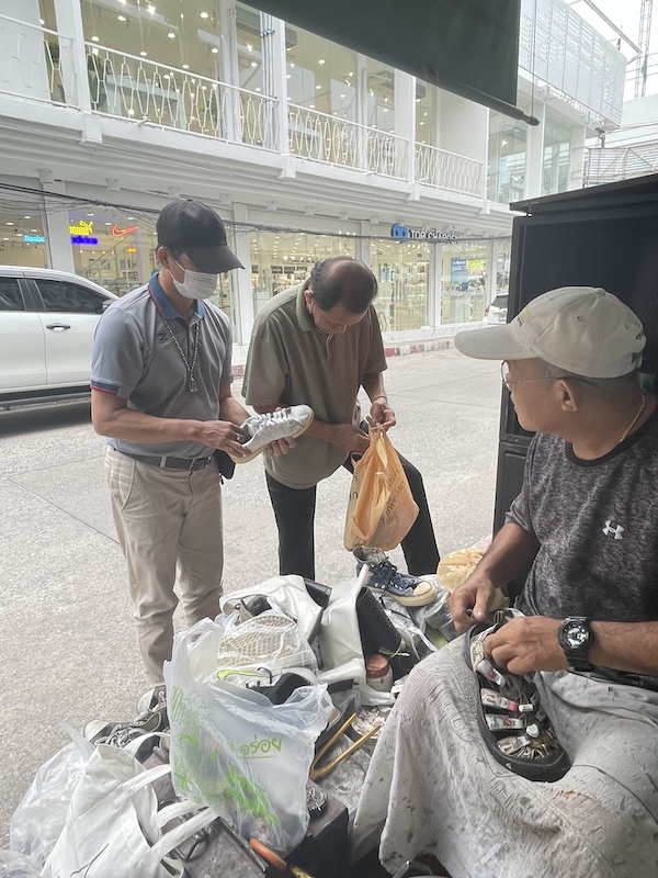 20分待てば直すよ、と言ってくれたので、市場で買い物して、ちょっと座って丁寧なおじさんの仕事ぶりを見て、しっかり靴底を縫い付けてくれて修理代100バーツ!