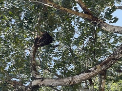 トランポリンのすぐ脇の木に、すごい蜂の巣が、、、。