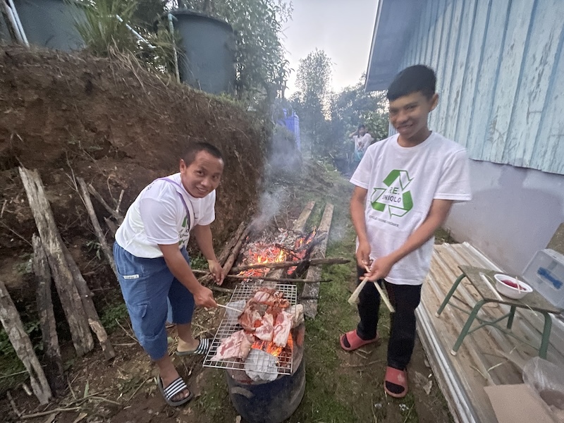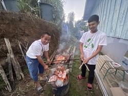 夜はお寺ボランティアチームの美味しいご飯とバーンロムサイの保父、モン属のコムさん特製豚の炭火焼きを堪能。