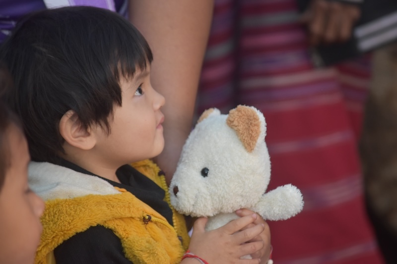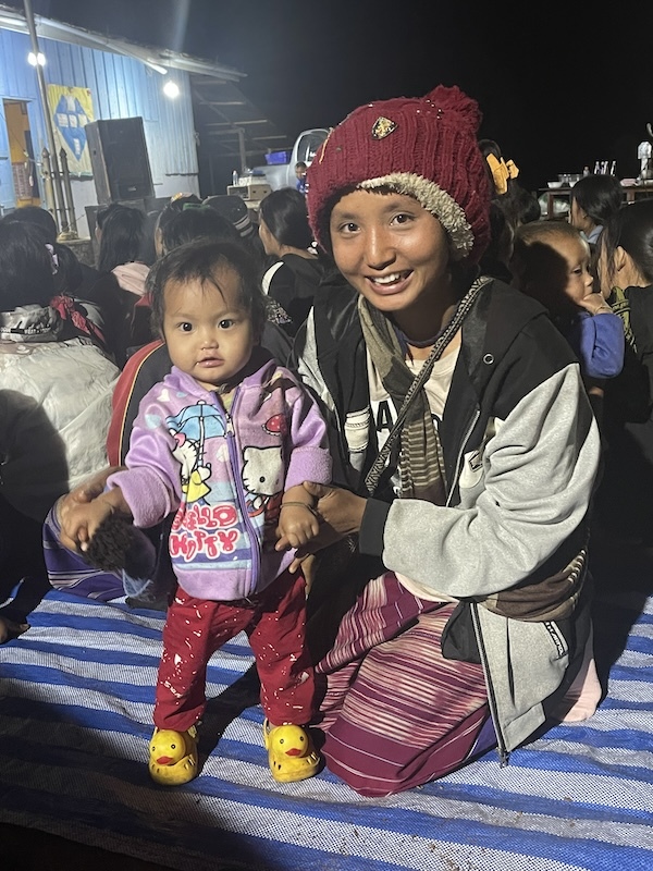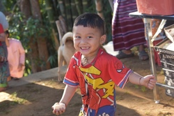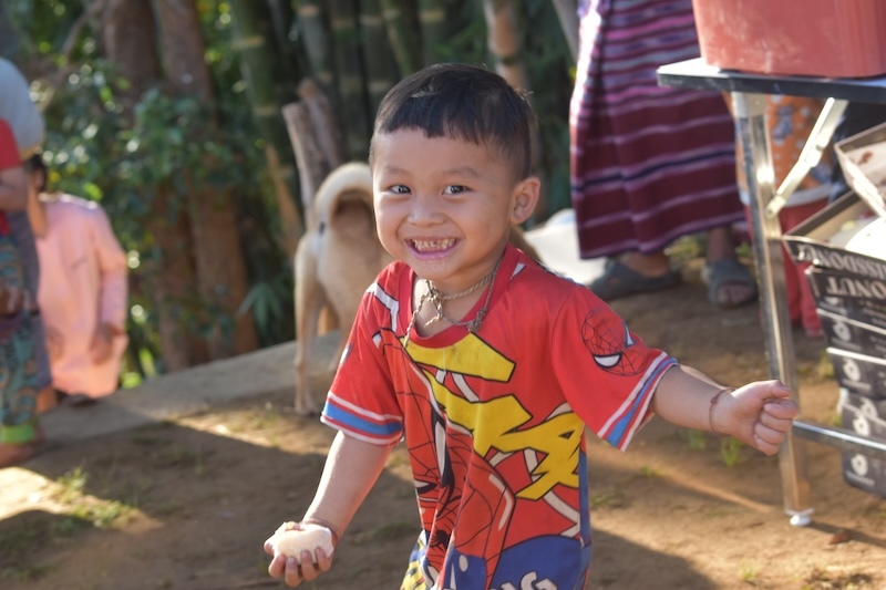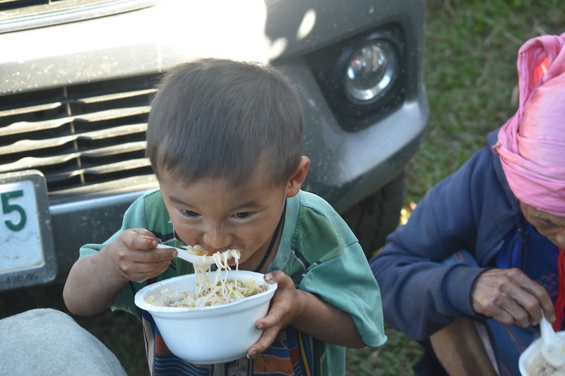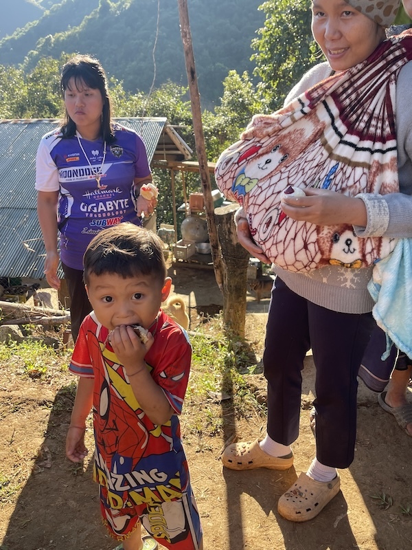 2時間半かけて急勾配のダート道を走り(ずっと四駆のローギア)、最初のフアイガイパー村に到着。そこでドーナッツを配り、大人たちにはヒートテックと支援物資を渡して、次のメーラアーノーグ村へ。