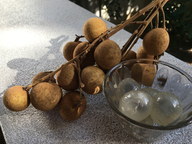この時期、ラムヤイ(竜眼)が旬を迎えています。自宅のは今ひとつまだ熟していませんでしたが、大工さんの家のラムヤイを今朝もらったら甘くてジューシーでとても美味しかった!!