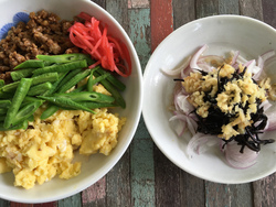 母が作ってくれたお弁当の中で私が一番好きだったのが3色ごはん。うちは鶏のひき肉に生姜たっぷりが定番で私もチェンマイで良く作って食べるのですが、この間無性に食べたくなり、でも鶏のひき肉がなくて冷凍庫にあったのが豚のひき肉。なんだか味付けも変えたくなりコチュジャンやナンプラーやにんにく入れたりとやってみたら、ちょっと韓国風アジアンテイストの三食ごはん。なかなか美味。好きな味。甘めの炒り卵はそのままでガッツリいただきました。大好きな紫タマネギと祝島のひじきに酢生姜という最近お気に入りの一品を添えて。