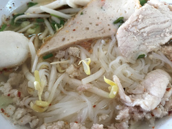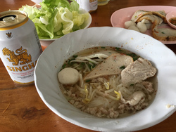 タイラーメン(通称クイッティアオ)の中でもベーシックなサッパリ系スープに米麺の中細とルクチンという魚のすり身や豚肉などが混ざったもの。自分でナンプラーや酢や唐辛子やお砂糖を好みで加え、好きな味にします。