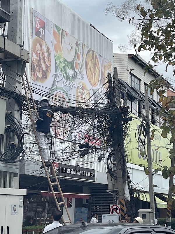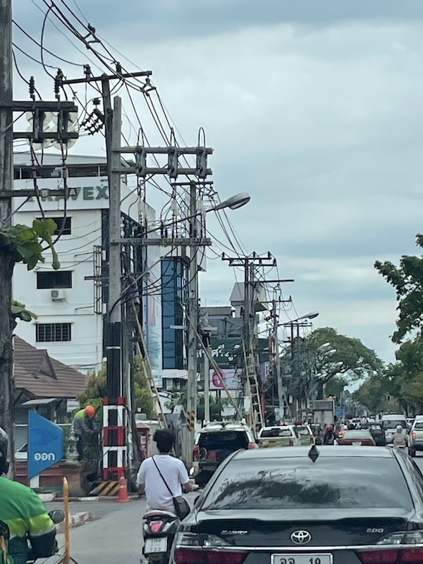 つまり電線を地下に埋める工事が終わり、必要なくなった電線を撤去しているのだと思います。