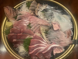 夕食はお付き合いのある美味しいお魚屋さんからの豪華お刺身盛り合わせと地元の猪肉の