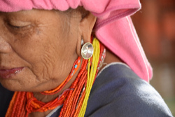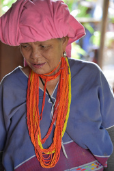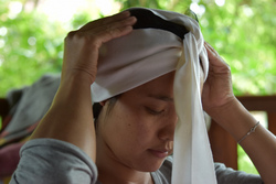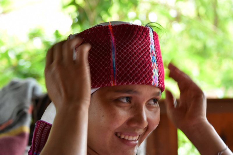 昔は1日中かぶっていた手織布の帽子。今は、行事の時以外あまりかぶらないそうです。ヤティーさんのお母さんやおばあさんもそうでしたし、ミャンマーのかなり奥地の少数民族も、タオル巻いている人が多い昨今。