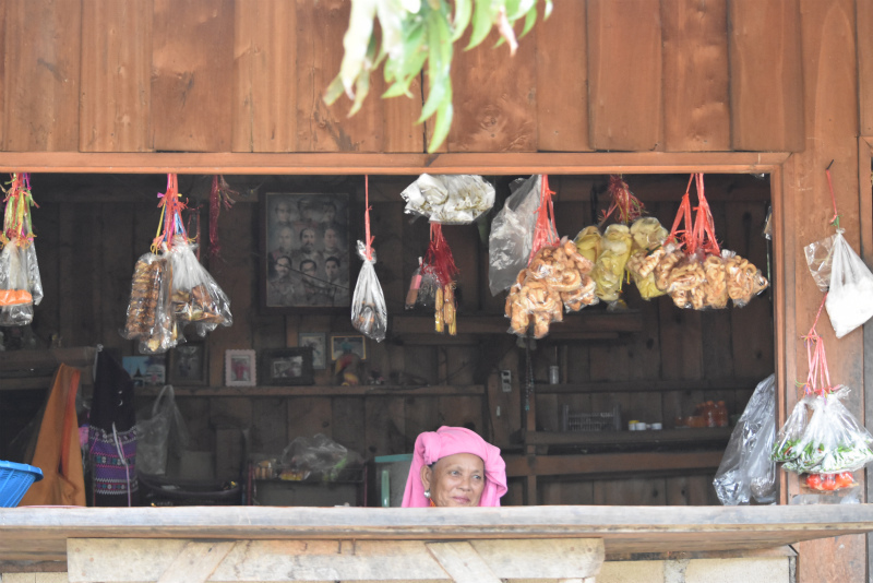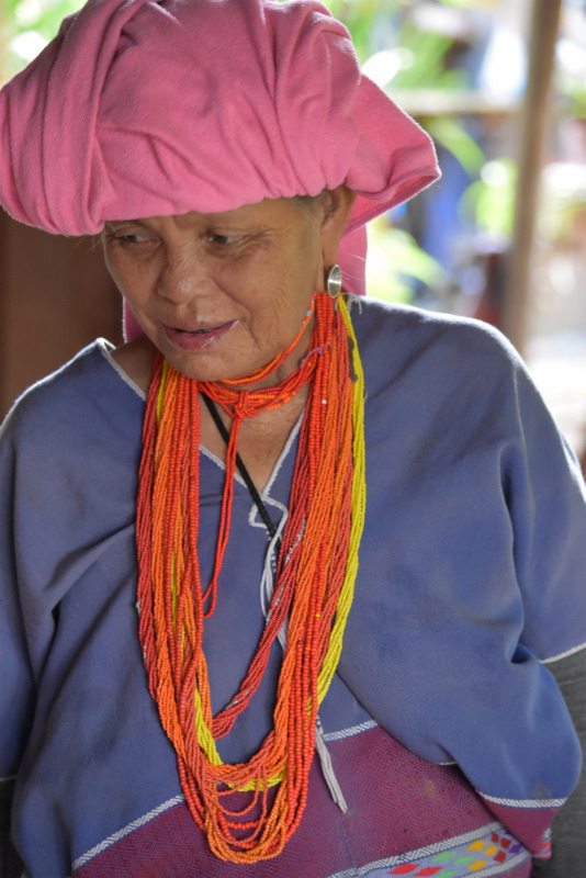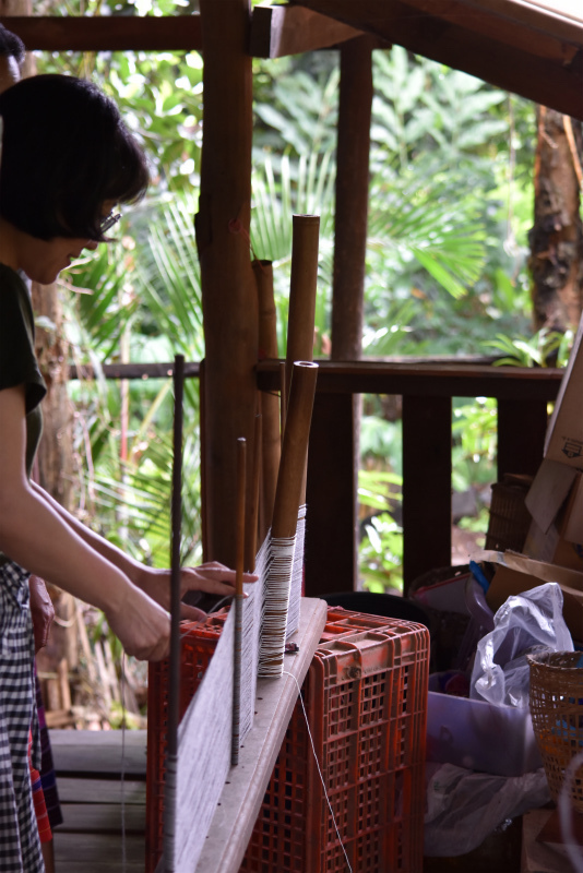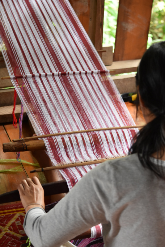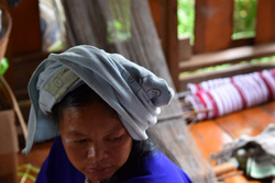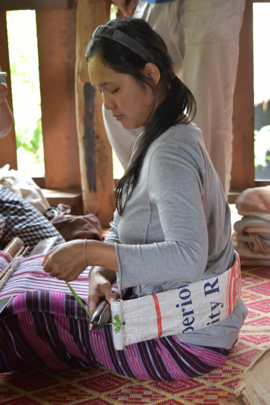 到着後、色々な草や木の皮などで染めた糸、それで織ったパガーヨーの衣類やバッグや布を見せてもらいながら、友人たちは織りを習ったり、織りや染めやパガーヨーの伝統文化や生活習慣に関して詳しく質問したり。それにきちんと答える若いヤティーさんはなんとも頼もしい一児の母。